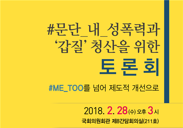 [TV서울=나재희 기자] 국회의원회관 제8간담회의실에서 ‘#문단_내_성폭력과 ‘갑질’청산을 위한 토론회 - #ME_TOO를 넘어 제도적 개선으로’토론회가 28일 오후 3시에 열린다.