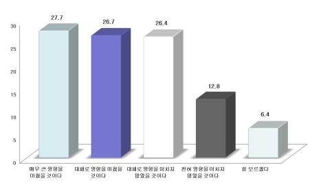 이어 39.2%는 ‘영향을 미치지 않았을 것’(대체로 영향을 미치지 않았을 것 26.4%. 전혀 영향을 미치지 않았을 것 12.8%)이라고 답했다. ‘잘 모름’은 6.4%였다.