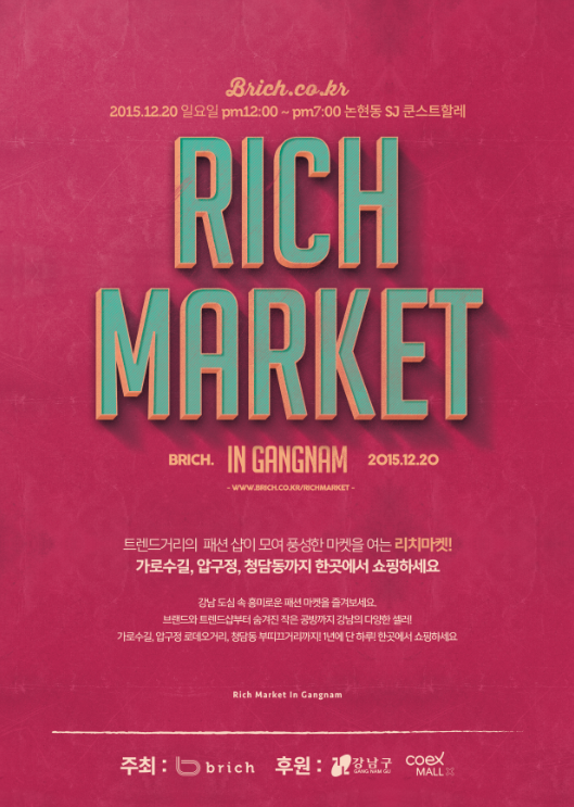 (주)브리치(대표 이진욱)에서 주관하고, 강남구와 ㈜코엑스몰(대표 박영배)이 후원하는 이번 행사는 20일 오전 12시부터 오후 7시까지 논현동 소재 컨테이너 문화공간 ‘쿤스트할레’에서, 가로수길과 압구정 지역의 젊고 개성 있는 디자이너 숍과 소호숍이 한자리에 모여 파격적 할인을 진행한다.