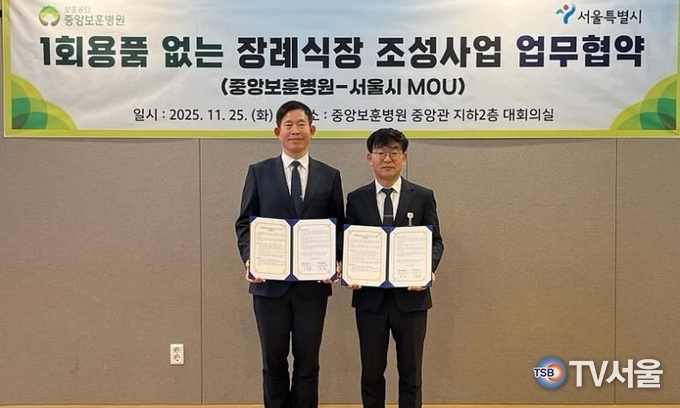 서울시는 25일 오후 3시 중앙보훈병원(병원장 신호철)과 ‘1회용품 없는 장례식장 조성을 위한 업무협약(MOU)’을 체결했다고 밝혔다. 협약식은 권 민 서울시 기후환경본부장, 이종훈 중앙보훈병원 행정부원장이 참석한 가운데 열렸다.