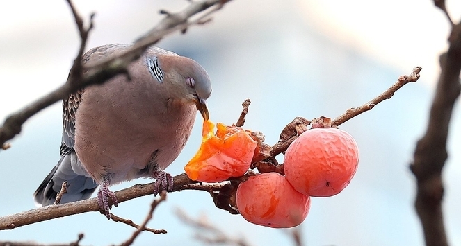 [TV서울=권태석 인천본부장] 12일 인천 중구 전동 한 주택 감나무에서 멧비둘기가 까치밥으로 남겨놓은 감을 먹고 있다.