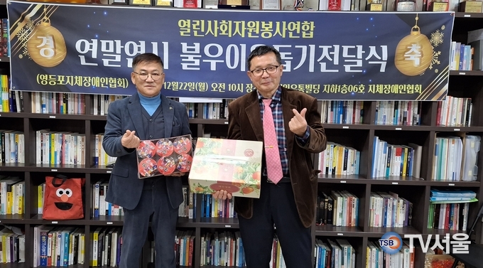 [TV서울=곽재근 기자] 열린사회자원봉사연합(상임대표 이규운)은 22일 오전 영등포구 코레일유통빌딩에 위치한 (사)한국지체장애인협회 영등포구지회(지회장 한경열)를 방문해 연말연시 불우이웃돕기 성품을 전달했다.