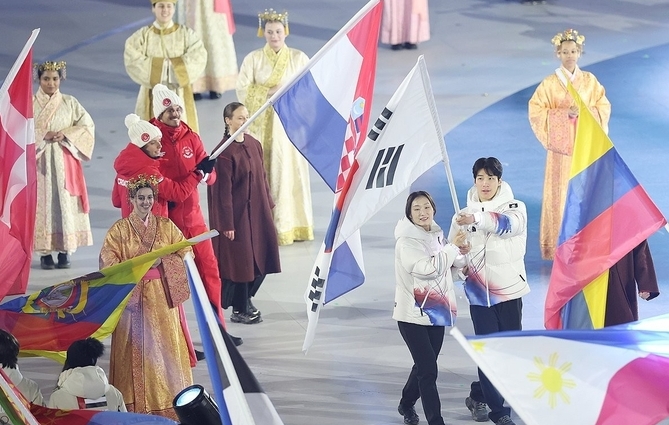 이번 대회를 마지막으로 올림픽 은퇴를 선언한 쇼트트랙 최민정(성남시청)과 은메달 2개를 획득한 쇼트트랙 황대헌(강원도청)이 우리나라의 기수를 맡았다.