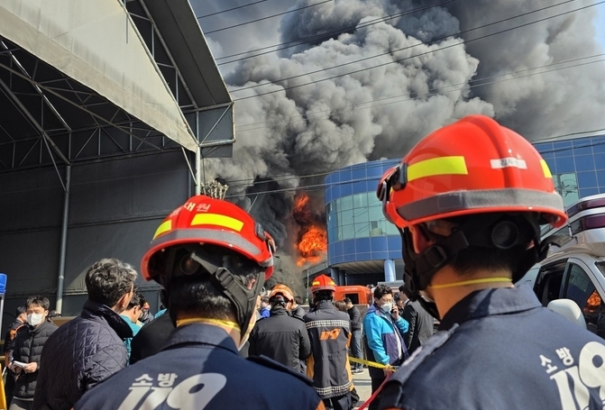 국가소방동원령까지 발령된 가운데 진화 작업이 이뤄지고 있으나 불이 난 지 4시간 가까이 시간이 흘렀음에도 공장에서는 까맣고 매캐한 연기가 매섭게 뿜어져 나오고 있다.