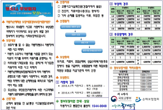 ‘정부보장사업’이란 뺑소니나 무보험차 사고로 사망하거나 부상당한 피해자가 어디에서도 보상받지 못할 경우 그 피해를 정부에서 보상하는 사회보장제도다.