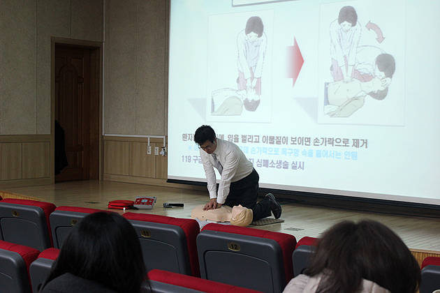 이날 교습자들은 소방관들로부터 학원 내에서 사고 발생 시 응급조치 방법 등을 교육 받았다. 교육은 강의와 심폐소생술 실습 등으로 진행됐다.