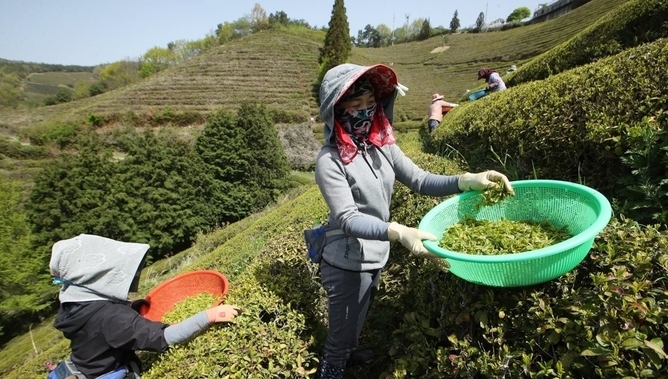 [TV서울=김선일 객원기자] 절기 곡우(穀雨)를 사흘 앞둔 17일 전남 보성군 회천면 한 녹차밭에서 농부들이 찻잎을 따고 있다.