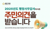 [TV서울=신민수 기자] 광진구의회(의장 전은혜)가 오는 11월 17일부터 진행되는 ‘2025년도 행정사무감사’를 앞두고 주민 의견을 10월 10일부터 11월 9일까지 총 31일간 접수한다. 구의회는 구민들의 다양한 의견을 적극적으로 수용하고자 ‘행정사무감사에 대한 주민의견’을 받고 있다. 제안 대상은 구정 전반에 걸친 위법·부당한 행정행위, 예산낭비 사례, 시책 개선 및 건의, 구민안전 저해 사항 등이며 접수 받은 내용은 행정사무감사 참고 자료로 활용된다. 다만, 개인의 사생활을 침해하는 사항, 단순 민원해결 요청 사항, 재판 또는 수사 중인 사항, 익명 제보 등 행정사무감사로 처리하기 부적절한 사항은 제외된다. 의견 접수는 광진구민이라면 누구나 참여할 수 있으며, 광진구의회 누리집의 열린마당 ‘행정사무감사 주민의견접수’ 게시판을 이용하거나 전화, 직접방문을 통해서 가능하다. 구민들의 의견은 올해 행정사무감사에 적극 반영될 계획이며, 처리결과는 행정사무감사 후 개별적으로도 통보한다. 전은혜 광진구의회 의장은 “구민 여러분의 소중한 목소리 하나하나가 광진구의 더 나은 미래를 만드는 든든한 토대가 된다”며, “접수된 의견에 진심으로 귀 기울이고, 세심하게 검토