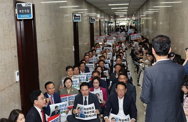 국민의힘 의원들은 강제수사에 반발해 원내대표실 앞에서 긴급 의원총회를 열고 농성을 벌였다.