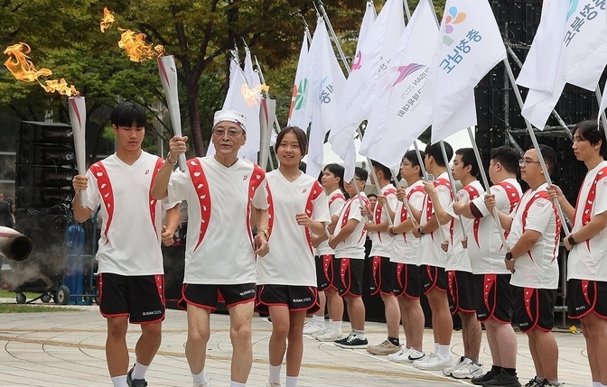 [TV서울=박양지 기자] 13일 오전 부산 연제구 시청 시민광장에서 열린 제106회 전국체육대회 및 제45회 전국장애인체육대회 성화 합화 및 출발식 행사에서 성화 봉송 첫 주자인 권중현 원로 체육인(1970년 방콕아시안게임 사이클 은메달리스트) 등이 성화를 들고 출발하고 있다.