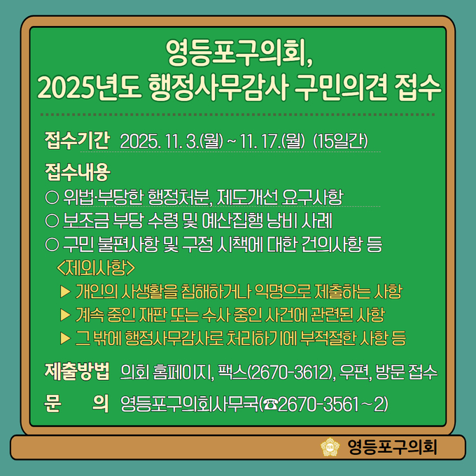 [TV서울=이천용 기자] 영등포구의회(의장 정선희)는 2025년도 행정사무감사를 앞두고 11월 3일부터 17일까지 15일간 구민 의견을 접수한다.