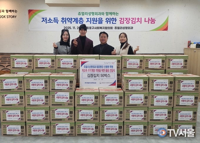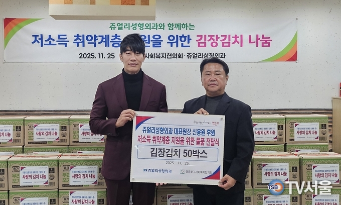 [TV서울=변윤수 기자] 쥬얼리성형외과 신용원 대표원장은 11월 25일 영등포구사회복지협의회(회장 박영준)를 방문해 지역 내 저소득 취약계층이 겨울을 따뜻하게 보낼 수 있도록 김장김치 10kg 50박스를 전달했다.