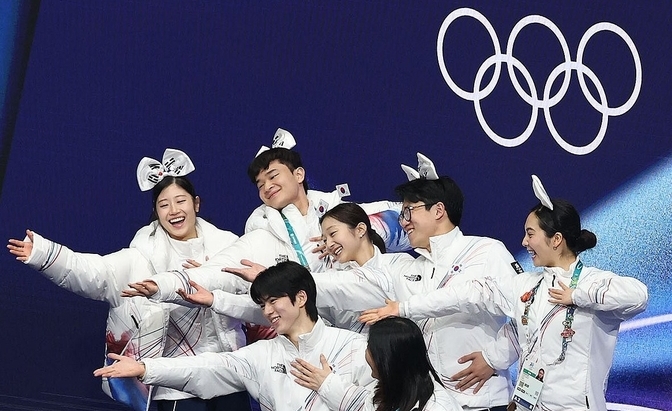 [TV서울=신민수 기자] 7일(현지시간) 이탈리아 밀라노 아이스스케이팅 아레나에서 열린 2026 밀라노-코르티나담페초 동계올림픽 피겨스케이팅 팀 이벤트 남자 싱글 쇼트 프로그램 출전한 차준환이 연기를 마친 뒤 다른 선수들과 포즈를 취하고 있다.