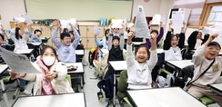[TV서울=심현주 서울1본부장] 16일 경기도 수원시 영통구 잠원초등학교에서 열린 방학식에서 4학년 학생들이 방학 안내문을 들고 즐거워하고 있다.