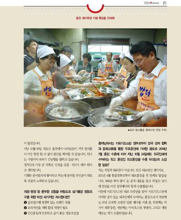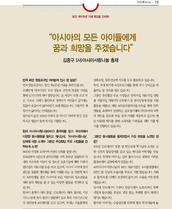 [TV서울] TV서울 자매지인 영등포포커스는 창간 11주년 기념을 맞아 사단법인 아시아사랑나눔 총재와 키르기즈스탄 명예영사로 활동하고 있는 김종구 총재를 만나 그간의 주요 업적과 향후 비젼에 대해 들어봤다.