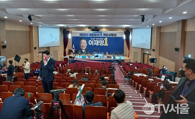 [TV서울=나재희 기자] 9일 오전 11시 여의도 국회 의원회관 대회의실에 마련된 더불어민주당 이재명 제20대 대통령선거 개표상황실에는 국내.외 유력 언론사들이 오후 7시 30분 투표 마감 이후 실시되는 개표상황을 취재하기 위해 준비하고 있다.