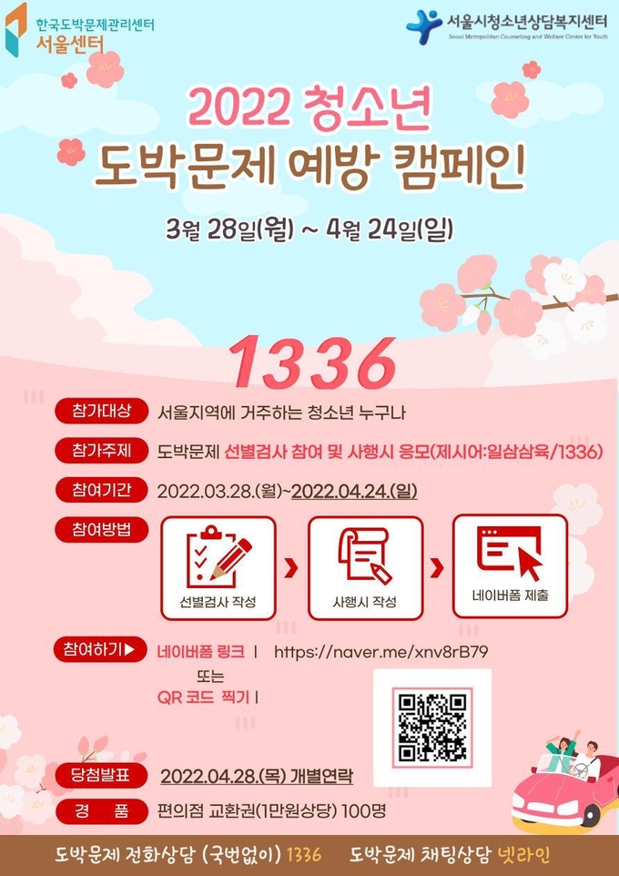 서울에 거주하는 청소년은 누구나 한국도박문제관리센터와 서울시 청소년상담복지센터 홈페이지에서 캠페인에 참여할 수 있다. 참여를 원하는 사람은 도박문제 심각도를 측정하는 선별검사에 응하고 ‘1336’ 또는 ‘일삼삼육’으로 사행시를 작성하면 된다, 선별검사 결과가 2점 이상 나왔을 경우 도박문제 조기개입 문자서비스에 동의하면 도박문제 예방·치유 관련 정보를 8주간 받아볼 수 있다.