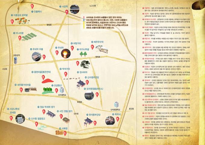 보물지도에 나오는 장소들은 개발로 인해 지금은 사라졌지만 토박이 노인들의 기억과 사료에 의해 복원됐다. 당대 최고의 화가였던 이중섭이 말년에 기거했던 신수동 이야기를 비롯해 마을 근처의 흙이 몹시 붉었다 하여 불리워진‘홍현마을’, 독을 굽는 개천이라고 붙여진‘독막내’, 조선시대 궁궐에 얼음을 바쳤던 곳인‘신수동 얼음창고’와 박석거리, 신수동부군당, 오금동산, 무쇠막, 장사바위 등의 위치가 설명과 함께 지도에 표시됐다.