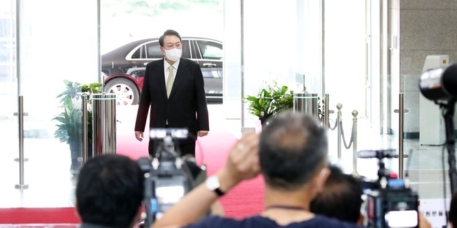 [TV서울=나재희 기자] 윤석열 대통령이 12일 오전 서울 용산 대통령실 청사로 출근하며 기자들과 거리를 두고 질의응답을 하고 있다.