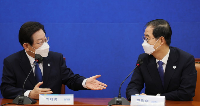 한 총리는 먼저 "민주당과의 협치, 협력으로 국정을 운영하길 기대한다"며 "이 대표의 조언과 경우에 따라 질책을 기대하고 있다"고 말했다.