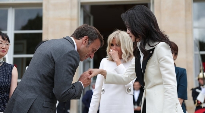 [TV서울=이현숙 기자] 2030 부산 엑스포 유치를 위한 국제박람회기구(BIE) 총회 참석차 프랑스를 방문 중인 윤석열 대통령과 김건희 여사가 20일(현지시간) 프랑스 대통령 관저인 엘리제궁에서 한-프랑스 정상 공동 언론발표에 앞서 에마뉘엘 마크롱 프랑스 대통령과 부인 브리지트 마크롱 여사의 영접을 받고 있다.