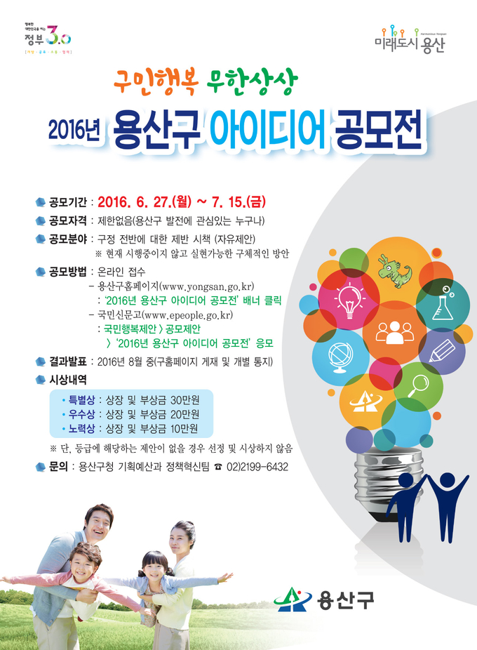 용산구 발전에 관심 있는 국민이라면 누구나 공모에 참여할 수 있다. 아이디어는 국민신문고(www.epeople.go.kr) 또는 용산구 홈페이지(www.yongsan.go.kr)를 통해 접수할 수 있으며 우수 아이디어 채택 시 소정의 상금을 지급한다.
