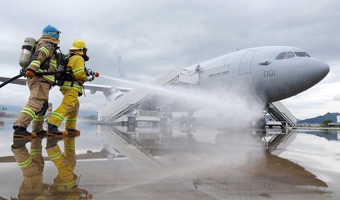 [TV서울=이현숙 기자] 18일 김해국제공항에서 공군 제5공중기동비행단과 한국공항공사 김해공항이 민관군 합동 항공기 사고 대응 훈련을 펼치고 있다.