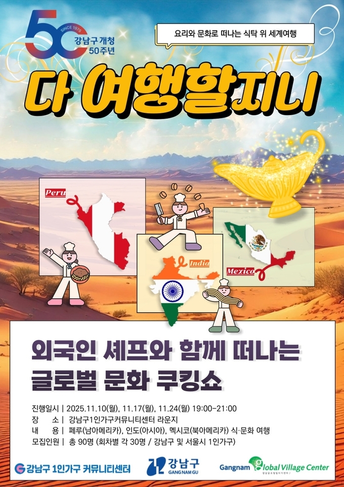 [TV서울=홍명실 시민기자] 서울 강남구(구청장 조성명)는 1인 가구를 위한 글로벌 쿠킹 문화쇼 '다 여행할지니'를 10일부터 24일까지 매주 월요일 오후 7시 1인 가구 커뮤니티센터에서 개최한다고 9일 밝혔다.