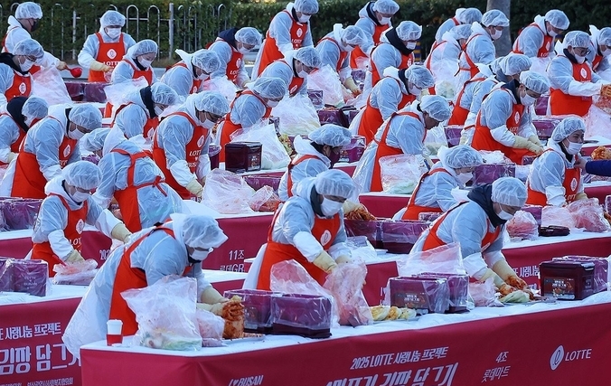 [TV서울=곽재근 기자] 3일 부산 동래구 사직야구장 광장에서 열린 1만포기 김장담그기 행사에서 롯데 임직원들이 이웃에게 나눠 줄 김장을 하고 있다.