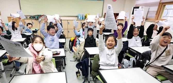 [TV서울=심현주 서울1본부장] 16일 경기도 수원시 영통구 잠원초등학교에서 열린 방학식에서 4학년 학생들이 방학 안내문을 들고 즐거워하고 있다.