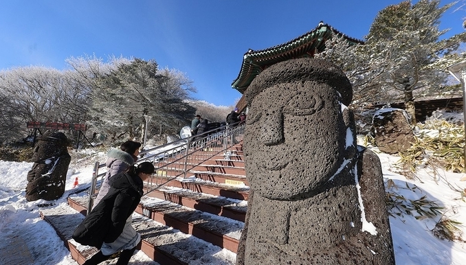 [TV서울=박지유 제주본부장] 맑은 날씨를 보인 27일 한라산 해발 1천100m에 있는 제주의 대표적인 설경 명소인 '1100고지' 휴게소 일대에 많은 관광객이 찾아 설경을 즐기고 있다.