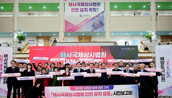[TV서울=권태석 인천본부장] 인천시는 3일 시청 중앙홀에서 '해사국제상사법원 유치 성공 시민보고회'를 열었다.