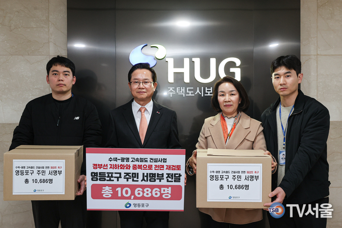 [TV서울=변윤수 기자] 영등포구(구청장 최호권)가 3월 20일 ‘수색~광명 고속철도 건설사업’과 관련해 주민 1만여 명의 탄원서를 국토교통부에 전달하고, 학교와 고층 대규모 아파트 단지 등의 하부를 관통하는 노선안에 대한 전면 재검토를 강력히 촉구했다.