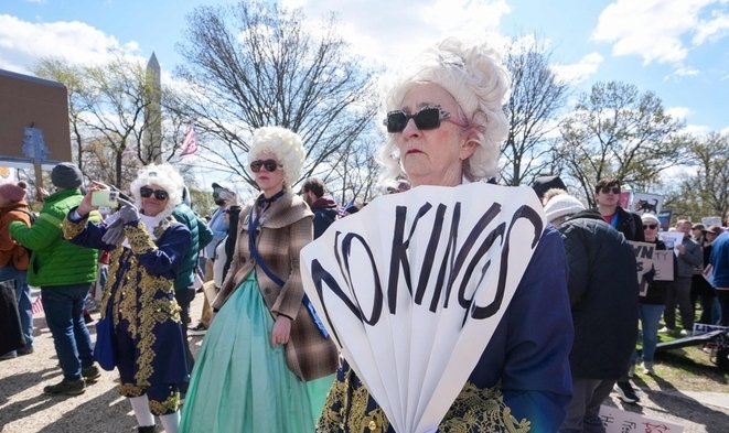 리사와 친구들은 성조기에 '손을 떼라'(HANDS OFF)라고 적어넣은 깃발도 만들어왔다. '노 킹스', '표현의 자유'라고 적힌 티셔츠도 갖춰 입었다.