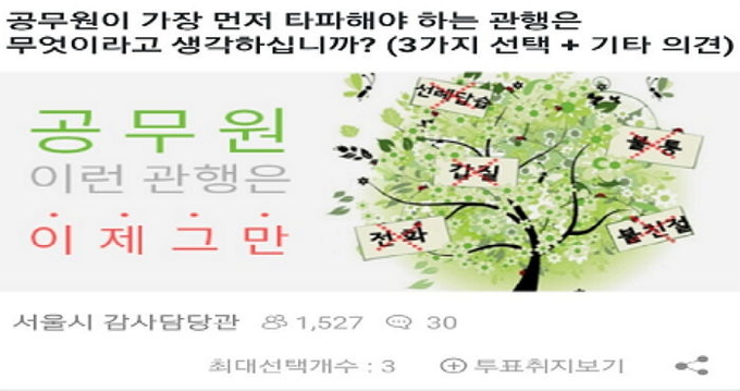 [TV서울=나현주 기자] 서울시는 '공무원! 이런 관행 이제 그만!'이라는 제목으로 모바일 투표 '엠-보팅(mVoting)'을 실시, '공무원이 가장 먼저 타파해야 하는 관행은 무엇이라고 생각하십니까?'라고 시민의견을 물었다.