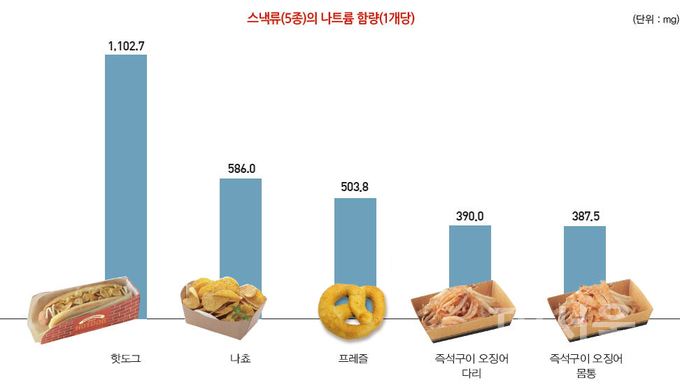 1개당 나트륨 함량은 ‘핫도그’(1.102.7mg) > ‘나쵸’(586mg) > ‘프레즐’(503.8mg) > ‘즉석구이오징어 다리’(390mg) > ‘즉석구이오징어 몸통’(387.5mg)순이었고, ‘핫도그’ 1개당 나트륨 함량은 1일 섭취기준치(2,000mg)의 절반이 넘는 55.1% 수준이었다.