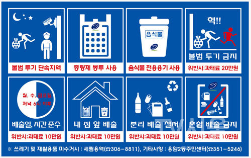 사물, 시설 행태 등을 일반 대중들이 쉽게 알아볼 수 있도록 나타낸 일종의 그림문자인 픽토그램을 이용하여 주민들이 쓰레기 배출 관련 안내사항을 쉽게 알아볼 수 있도록 제작했다. 불법투기 단속지역, 종량제 봉투 및 음식물 전용용기 사용안내, 불법투기 및 혼합배출 금지, 배출일 시간 준수, 분리배출 철저 내 집 앞 배출 총 8가지 경고 사항과 위반 시 과태료 부과에 대해서도 적혀있다.