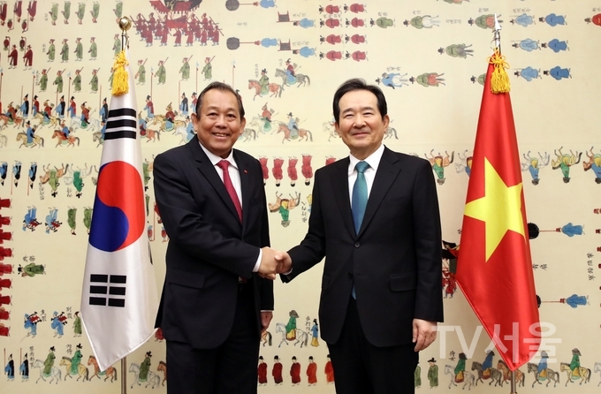 [TV서울=김용숙 기자] 정세균 국회의장이 22일 오전 10시 국회접견실에서 쯔엉 화 빙(Truong Hoa Binh) 베트남 수석부총리를 만나 양국간 경제협력 강화 및 교류확대 방안에 대해 의견을 나눴다.