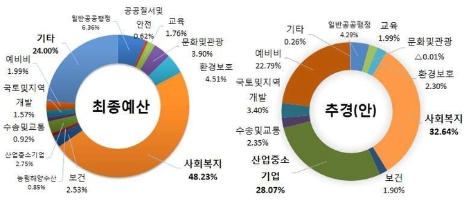 분야별 예산편성 규모로는 국고보조사업과 공모사업 예산이 많이 포함된 사회복지와 산업중소기업분야가 각각 73억 원(32.64%), 63억 원(28.07%)으로 가장 높은 비중을 차지했다. 이밖에 일반공공행정 10억 원, 국토및지역개발 8억 원, 수송및교통 5억 원, 환경보호 5억 원 등 순으로 반영됐다.