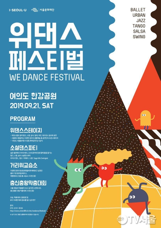 탱고‧스윙‧살사‧발레‧어반‧재즈 등 6개 주요 춤 장르의 매력을 맛볼 수 있는 생활예술 춤 축제 ‘위댄스 페스티벌(WE DANCE FESTIVAL)’이 ‘5개 무대, 6개 장르, 7시간의 춤 난장!’란 주제로 21일 오후 2시부터 9시까지 여의도 한강공원 일대에서 펼쳐진다.