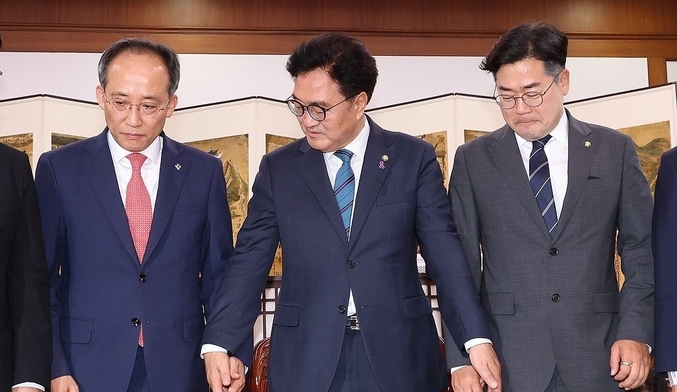 [TV서울=나재희 기자] 우원식 국회의장이 10일 오후 국회의장실에서 국민의힘 추경호 원내대표, 더불어민주당 박찬대 원내대표와 회동하기에 앞서 기념촬영을 하던 중 양당 원내대표의 손을 잡고 있다.