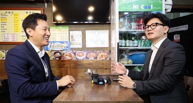 [TV서울=나재희 기자] 국민의힘 한동훈 당대표 후보(오른쪽)와 오세훈 서울시장이 5일 오전 서울 용산구 동자동 쪽방촌 동행식당에서 만나 조찬을 하고 있다.