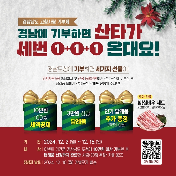 [TV서울=김기명 경남본부장] 경남도는 2일부터 세액공제, 기본 답례품 외에 인기 답례품을 추가로 증정하는 고향사랑기부제 감사 이벤트를 시작했다고 밝혔다.