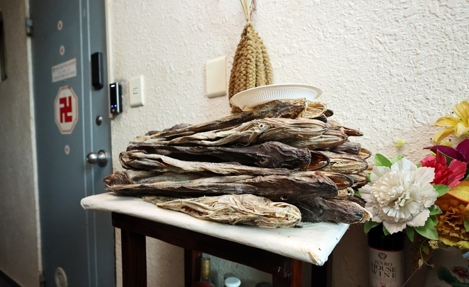 입구 옆에는 제사 등에 사용된 것으로 보이는 북어 더미, 말라버린 잡채 그릇, 정체를 알 수 없는 붉은 국이 담긴 냄비가 놓여 있었다. 북어 중 일부는 여전히 입속에 현금이 들어 있기도 했다.