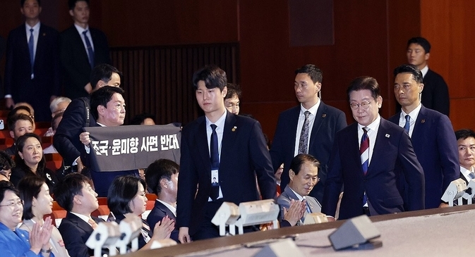 [TV서울=나재희 기자] 국민의힘 안철수 의원이 15일 서울 세종문화회관에서 열린 80주년 광복절 경축식에서 이재명 대통령이 경축사를 마치고 자리로 향할 때 '조국·윤미향 사면 반대'라는 문구가 적힌 펼침막을 들어보이고 있다.