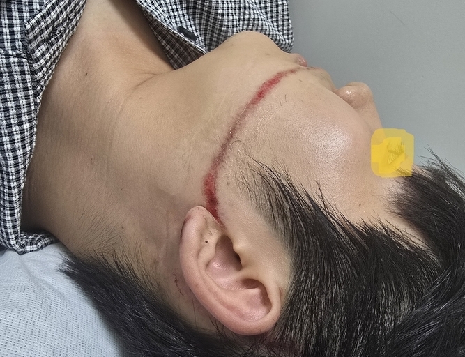 A씨는 왼쪽 손등 10㎝, 얼굴 정면 왼쪽 입술~귓바퀴~정수리까지 40~50㎝가량 찰과상을 입었고, 귀 뒤쪽은 2.5~3㎝가량 찢어져 병원 응급실에서 봉합수술을 받기도 했다.