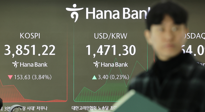 이날 오전 11시 8분 현재 코스피는 전장보다 139.98포인트(3.50%) 내린 3,864.87이다.