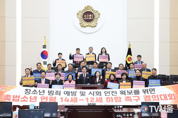 [TV서울=권태석 인천본부장] 인천광역시의회는 15일 제305회 제2차 정례회 제3차 본회의에서 이강구 의원(국민의힘·연수5)이 대표 발의한 ‘청소년 범죄 예방 및 사회 안전 확보를 위한 촉법소년 연령 하향 촉구 결의안’을 의결한 후 본회의장에서 촉법소년 연령 하향 촉구 결의대회를 개최했다.
