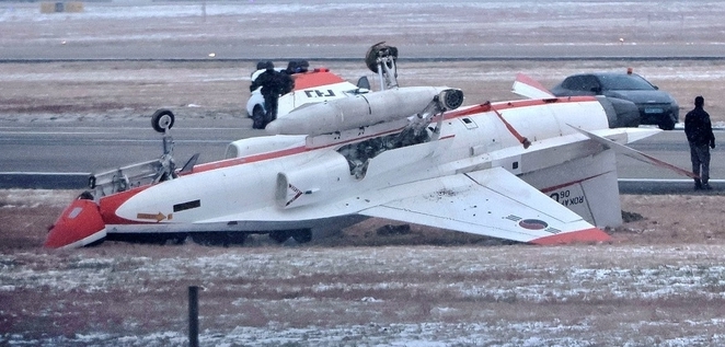 [TV서울=박양지 기자] 2일 광주 광산구 광주공항 활주로에 공군 훈련기 T-50이 전복돼 있다.