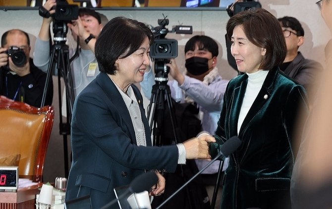 [TV서울=나재희 기자] 7일 국회에서 열린 법제사법위원회 전체회의에서 더불어민주당 소속 추미애 위원장(왼쪽)과 국민의힘 나경원 의원이 악수하고 있다.